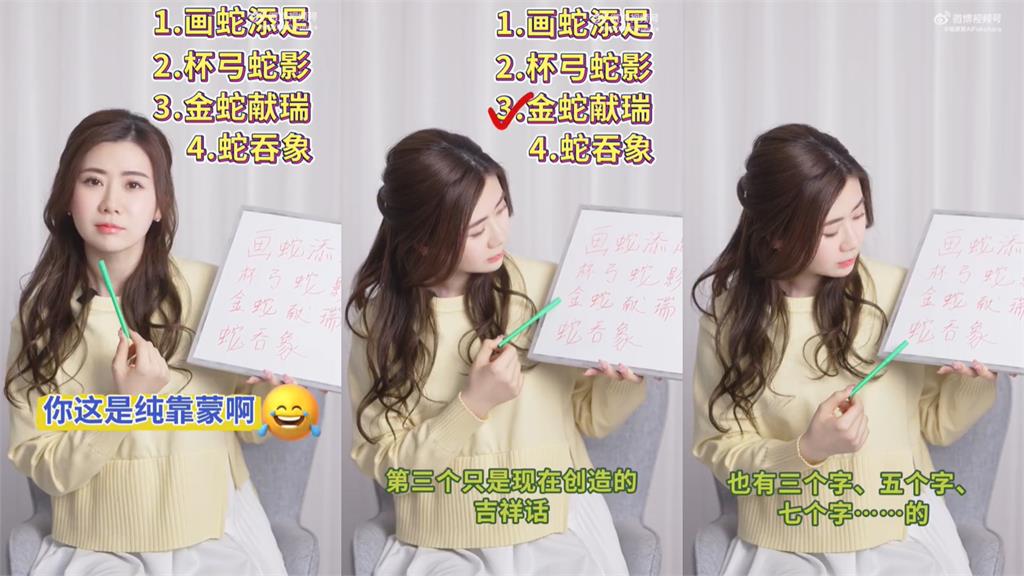 福原愛平時用心經營中國社群平台,日前透過微博上傳一段1分54秒的影片,可以看見她帶著精緻妝髮,穿著黃色毛衣,端莊的坐在椅子上,展現出婉約的一面。工作人員告知福原愛今天要挑戰成語,引發了她的好奇心,下秒接過場外人員給予的白板,上面寫著「畫蛇添足」、「杯弓蛇影」、「金蛇獻瑞」、「蛇吞象」,要她選出4組詞中不是成語的詞。福原愛推測「3個字的就不是成語囉?」,接著針對「蛇吞象」一詞詢問「不是大象把蛇吞掉嗎?是吧?是把…大象把蛇吞下去。」。