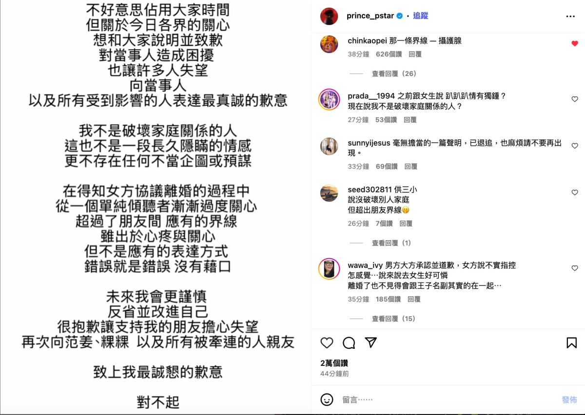 圖/王子透過社群平台發表聲明,遭網友留言。(翻攝 粿粿IG)