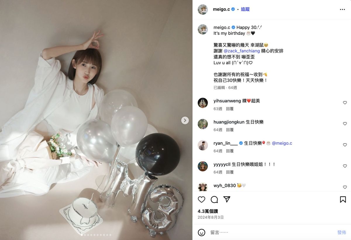 有網友在Threads指出,粿粿的生日是8月3日,范姜則是7月28日。從她2021至2024年期間的發文可見,每年都會以氣球、蛋糕、旅遊照等形式慶祝自己的生日,內容滿溢感謝與喜悅。去年她甚至寫下「Happy 30.ᐟ.ᐟ It’s my birthday」,還特別感謝丈夫為她準備驚喜,看似恩愛。