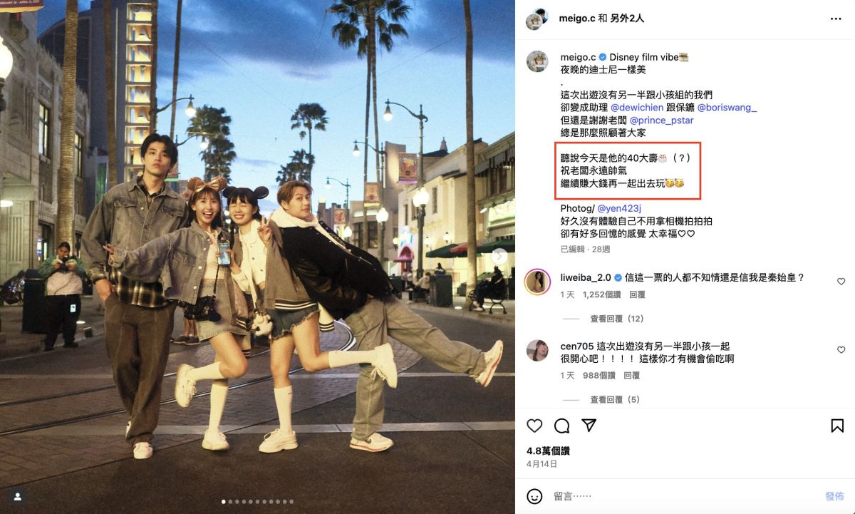 當天適逢藝人王子生日,現年36歲的他並非粿粿的家人,卻在當天獲得一篇來自粿粿的IG祝賀文。貼文以「迪士尼之旅」為主題,內文寫道:「聽說今天是他的40大壽(?)祝老闆永遠帥氣」,並特別標註王子的帳號。雖然文中帶點戲謔,但對照丈夫生日的冷處理,立刻引來網友關注。