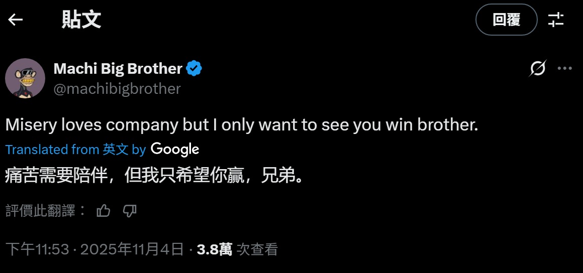 據先前報導,黃立成早前已因連續爆倉導致帳戶淨值從約190萬美元驟減至14.9萬美元,短短20天虧損近17億新台幣。即便如此,他仍持續加碼操作,並於社群留言「痛苦需要陪伴,但我只希望你贏,兄弟」,表達對市場的堅持。
